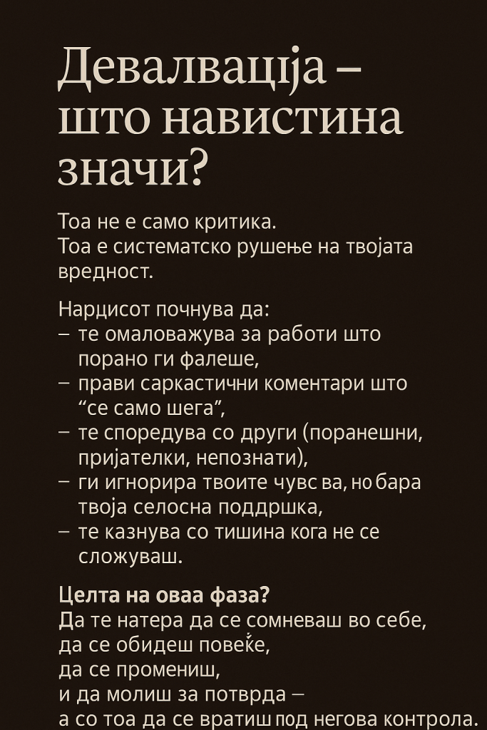 • Идеализација – девалвација – отфрлање(класичен циклус на нарцисистичка врска)**