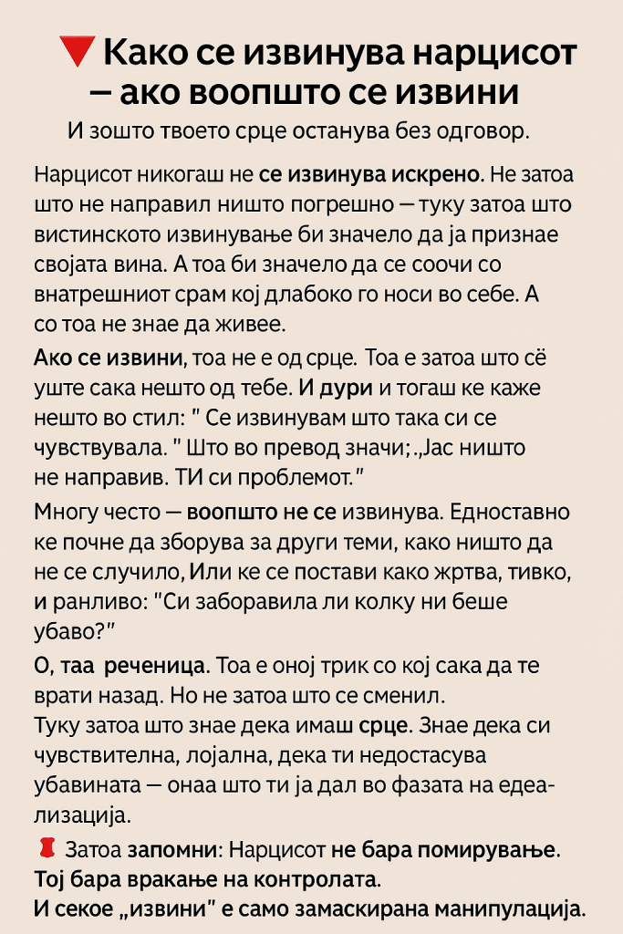 📌 Затоа запомни: Нарцисот не бара помирување. Тој бара враќање на контролата. И секое „извини“ е само замаскирана манипулација.